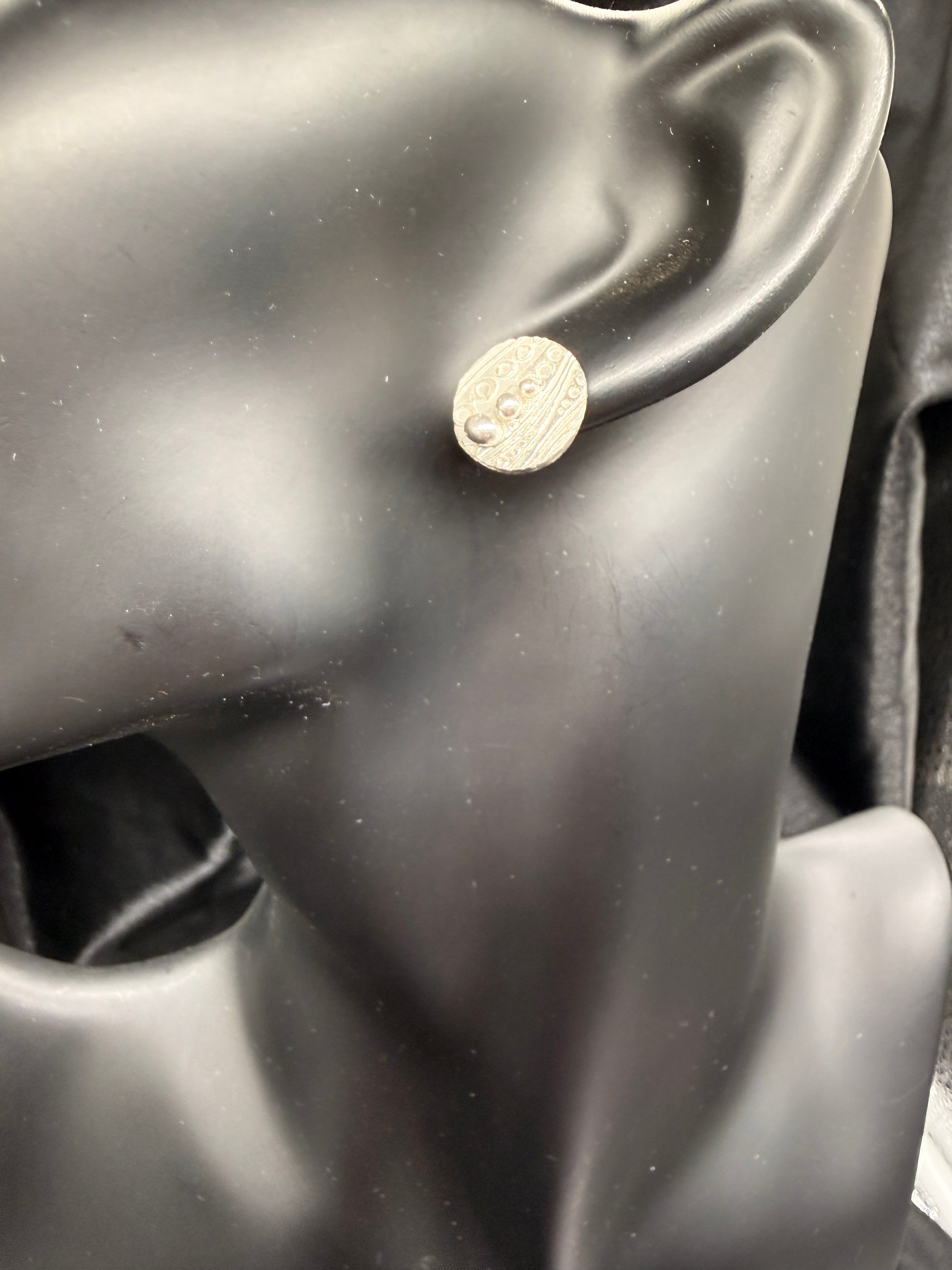 Elevate your everyday look with these exquisite circular stud earrings, handcrafted in .999 pure silver. Each piece showcases delicate polka dot embellishments layered over a textured circular surface, creating sophisticated dimension that catches the light beautifully. Perfect for those who appreciate understated elegance with artistic flair, these versatile studs transition seamlessly from casual to formal occasions. The premium silver construction ensures lasting quality and a lustrous finish that complements any skin tone. A timeless addition to your jewellery collection that speaks to refined taste.