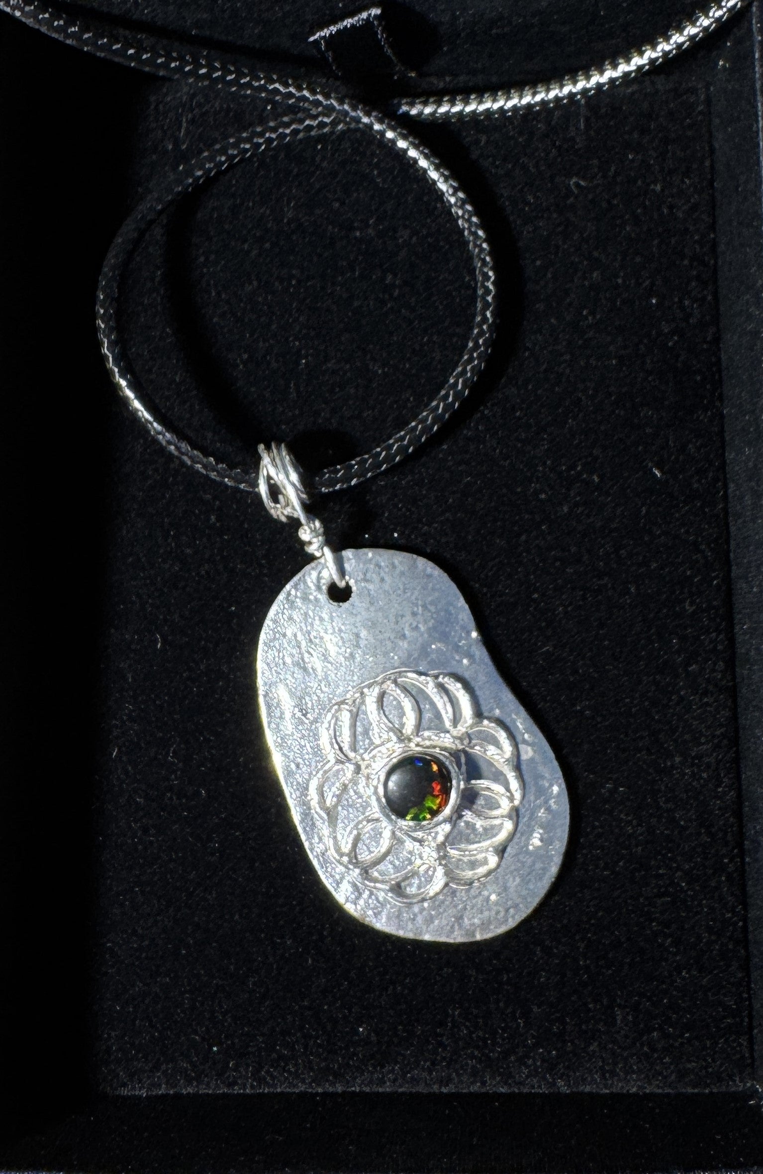 Discover the simple beauty of our Filigree Flower Pendant! Admire the intricate filigree design that showcases the artistry of 999 silver, perfectly complemented by a radiant red cultured opal. Elevate your look with this fun design – a must-have for any jewellery collection!