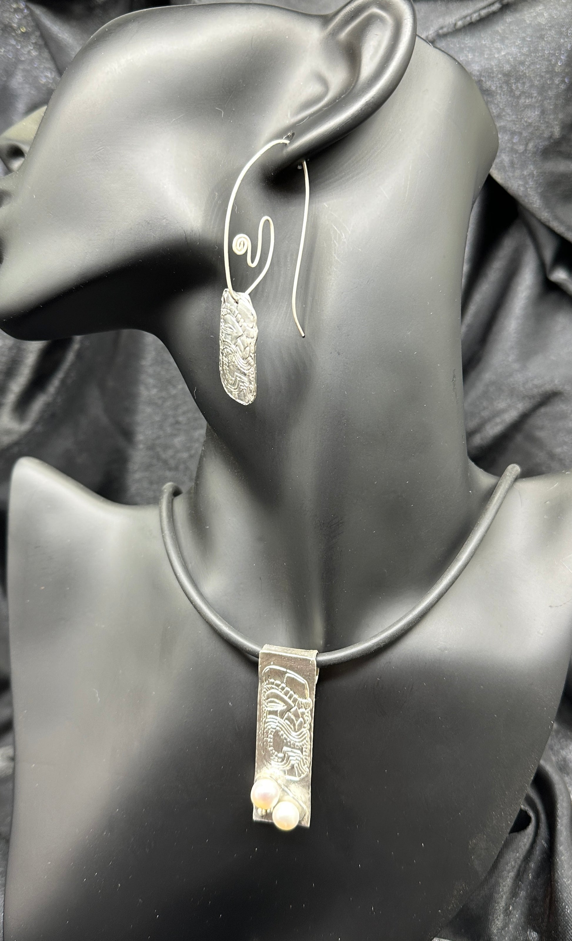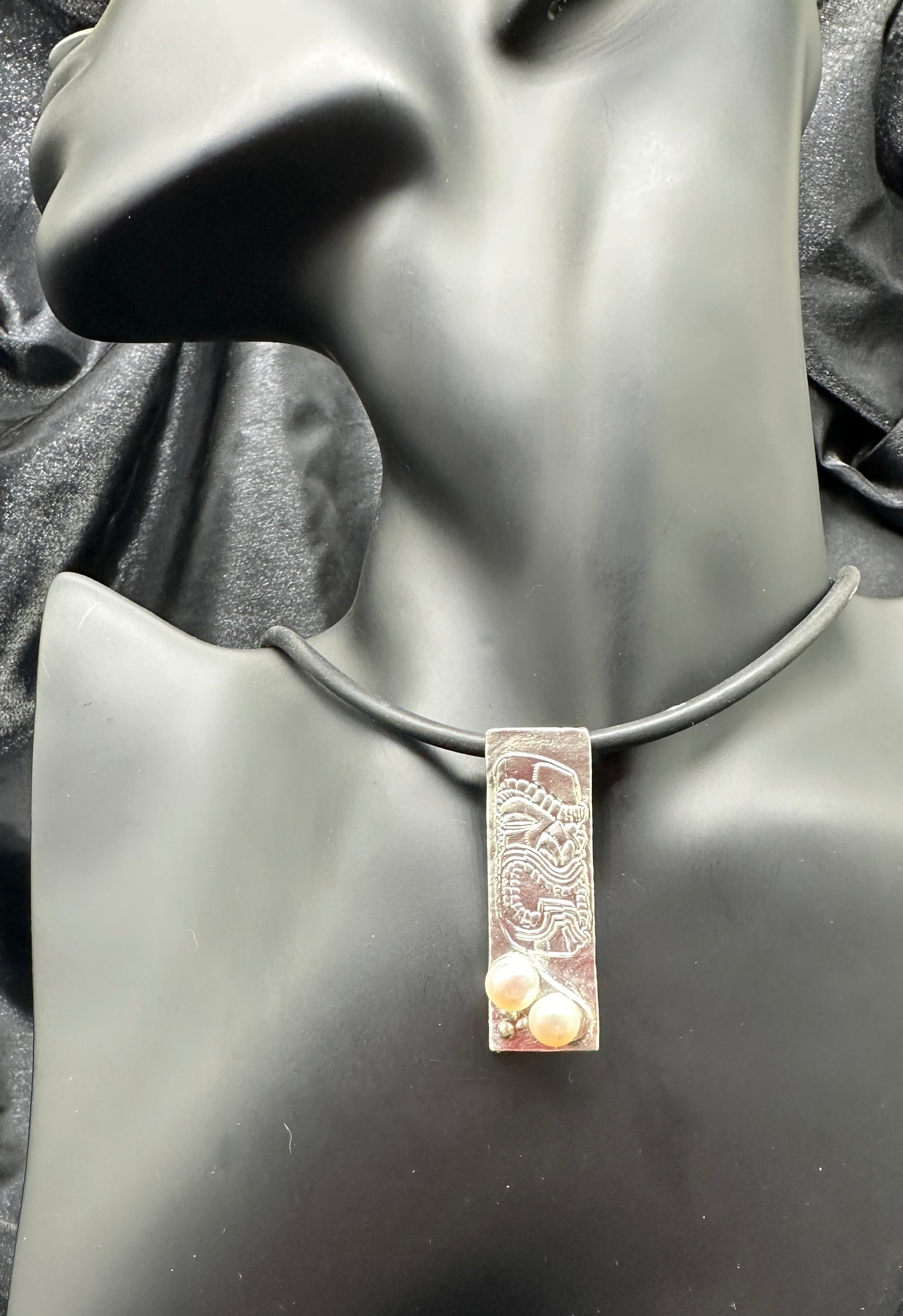 A tribal texture on this pendant made from SS2 sterling Silver metal clay in a rectangle shape, with a hidden bail, and 2 fresh water pearls, gives a beautifully elegant touch to your outfit weather it be a casual look or a more formal evening look, and can be teamed with a tribal earrings in SS2.